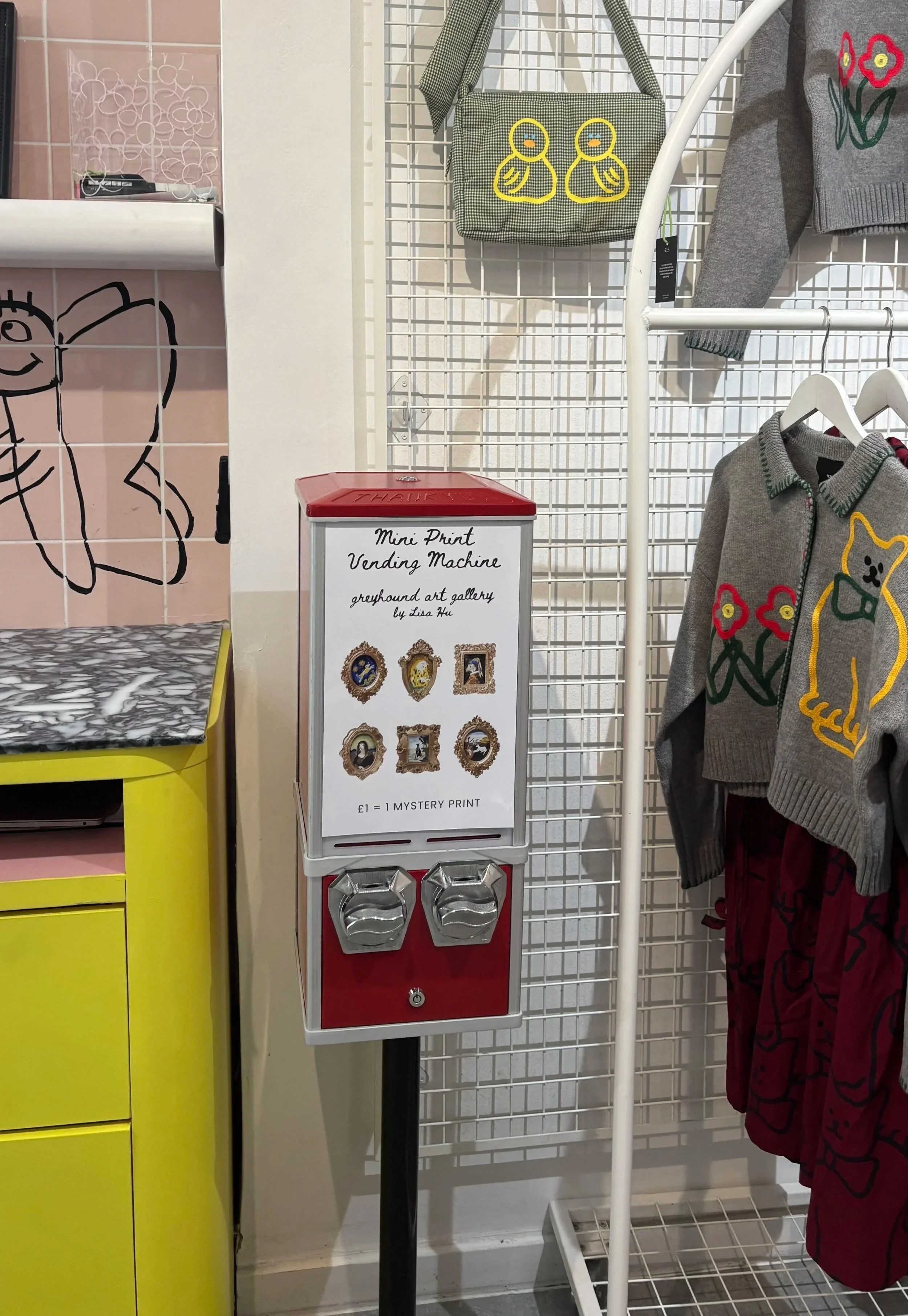 My mini print vending machine is a pop up gumball-size machine that dispenses mini prints for £1 in London. Prints can be customised to a theme, so get in touch if you have a store and would like to have the machine!
